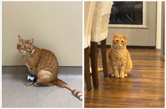 Cheese traveled 265 miles in March from his home in Greenville, South Carolina, to North Carolina State Veterinary Hospital, where he received four hemodialysis treatments to support his body while his injured kidneys healed. Today (right), he is back to his social, cuddly self, his owners say.