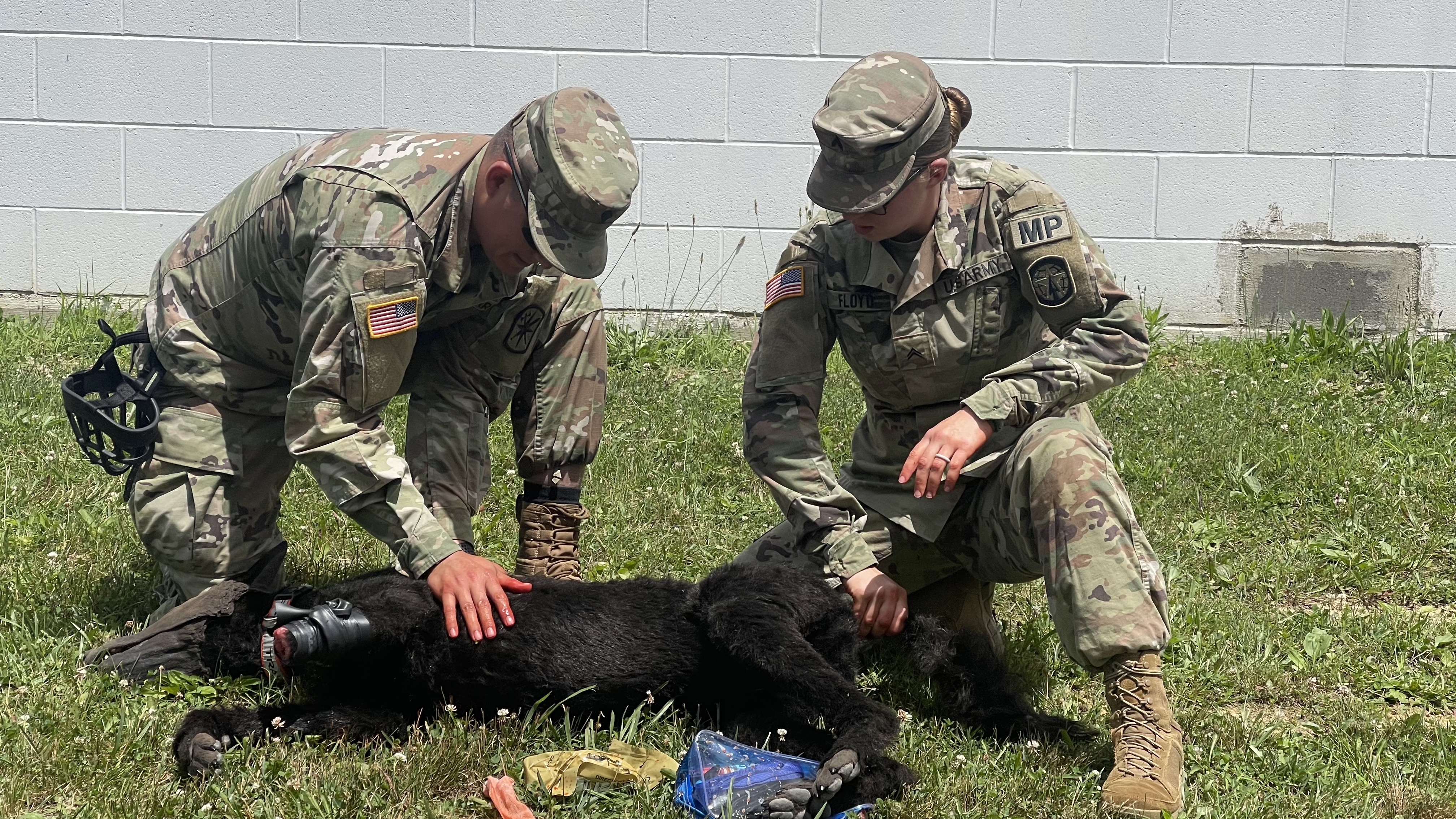 During K9 Medic training, military working dog handlers practice lifesaving trauma care to an injured K9, represented by a K9 simulation manikin.